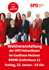 Hohenthann. Am 23. Januar, um 19 Uhr findet eine Wahlveranstaltung im Gasthaus Heckner in Grafenhaun statt. Die Kandidatinnen und Kandidaten für den Gemeinderat Hohenthann stellen sich, ihre Ideen und Ziele vor.