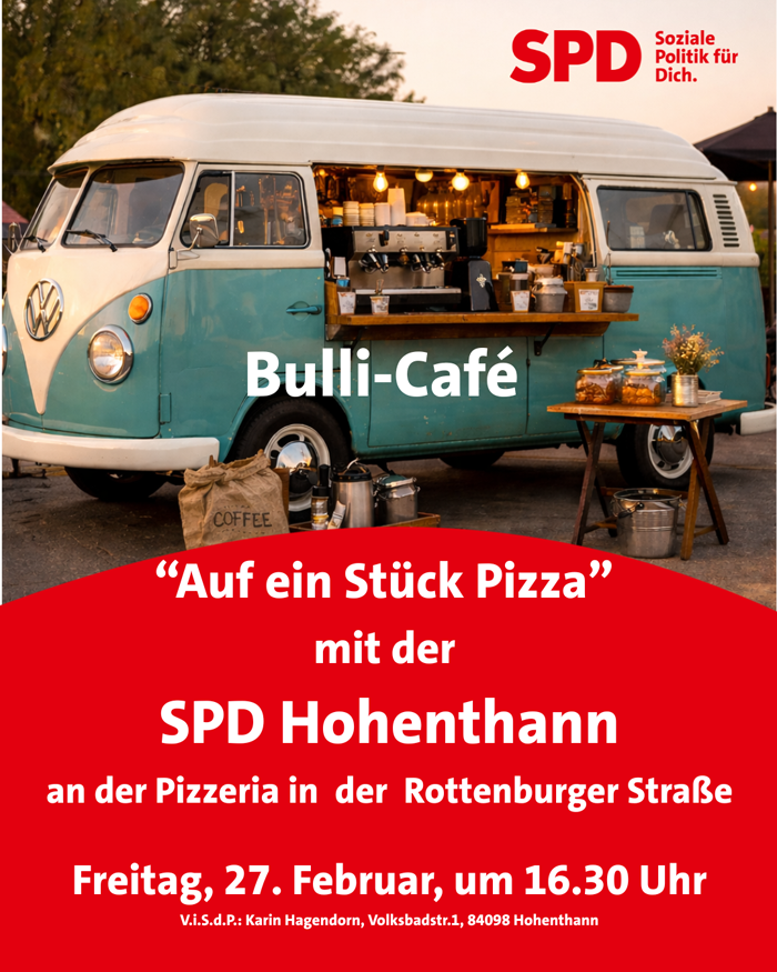 Die SPD Hohenthann lädt am 27.2.2026, um 16.30 Uhr zum Wahlkampfabschluss "Auf ein Stück Pizza" ein. Das "Bulli-Cafe" mit Gerd Babl, Bürgermeister a.D. aus Velden, kommt zur Pizzeria an der Rottenburger Straße beim Netto. Die Landratskandidatin Ruth Müller und die Gemeinderatskandidatinnen und -kandidaten stehen für Gespräche und Informationen bereit. Wir freuen uns auf guten Informationsaustausch mit Jung und Alt.