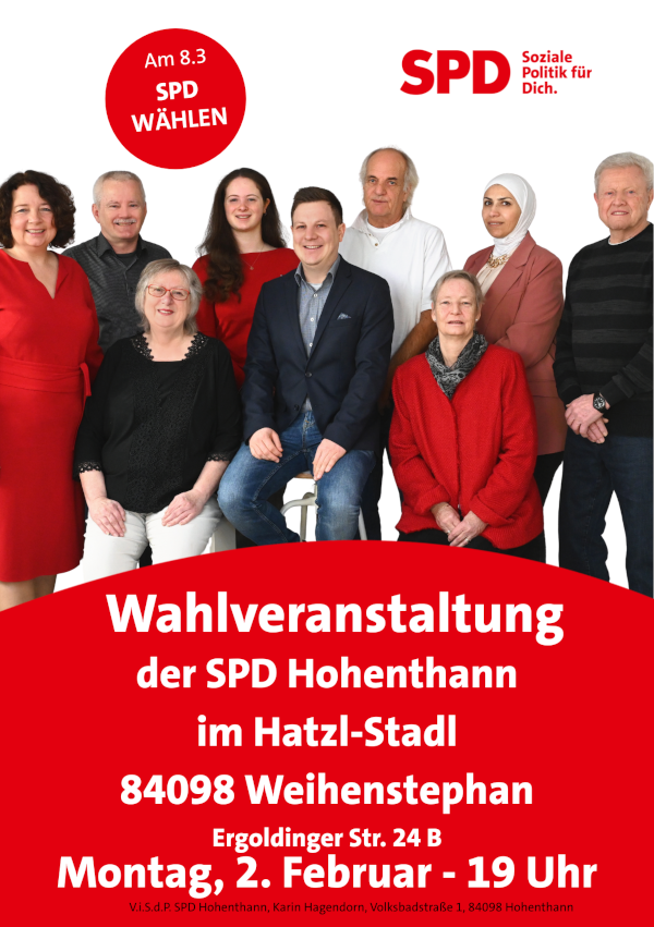 Es folgen weitere Termine jeweils um 19 Uhr in Eberstall/Andermannsdorf am 5.2., beim Vilserwirt in Hohenthann am 10.2. und in Wachelkofen in der Gastwirtschaft Veitl am 12.2. Näheres wird jeweils in der Presse bekanntgegeben. Interessierte Gemeindebürger sind herzlich eingeladen, um mit den SPD Kandidatinnen und Kandidaten ins Gespräch zu kommen.